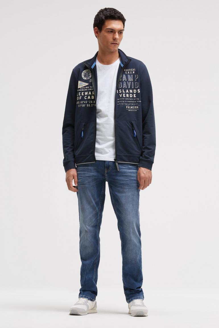 Tato lehká mikina od CAMP DAVID má vzhled teplákové bundy a vytváří sportovní vzhled. Výrazné potisky log pokrývají přední část velkým potiskem a na rukávech a horní části zad působí menším dojmem. Pruhovaná páska zvýrazňuje stojáček a lem. Materiál: 70% bavlna, 24% polyester, 6% elastan