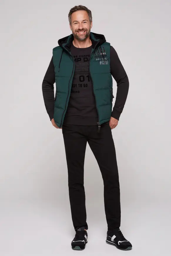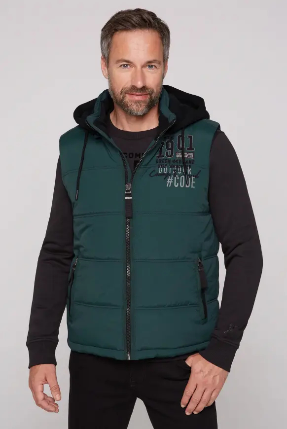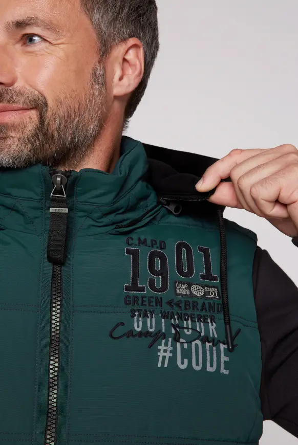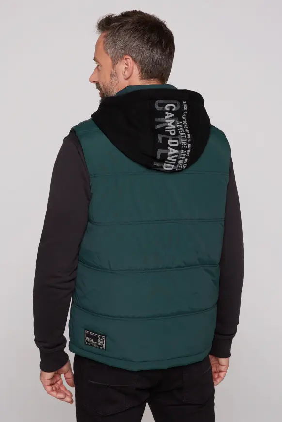 Tato prošívaná vesta od CAMP DAVID přichází v neformálním designu. Je vyrobena z texturovaného nylonového žebra a má žerzejovou podšívku. Kontrastní potní kapuci s výšivkou loga lze stáhnout na zip. Na levé přední straně je umístěn potisk štítku s výšivkou. Vesta příjemně hřeje a lze ji snadno kombinovat. Materiál svrchní látka: 100% polyamid, materiál kapuce: 50% bavlna, 50% polyester, podšívka: 100% bavlna, výplň: 100% polyester