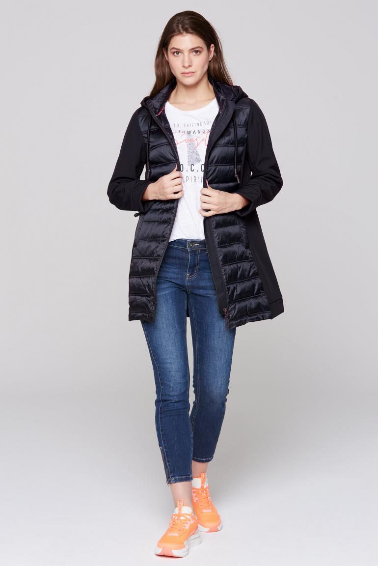 Dlouhá softshellová bunda od SOCCX je sportovní a funkční přechodná bunda. Zaboduje tonální směsí materiálů s prošíváním, které zvýrazňuje přední a zadní třmen. Kapuce je rovněž z lehkého prošívání a lze ji stáhnout na zip. Boční kapsy se zapínají na skryté zipy. Zadní stranu zdobí lesklý potisk etiket. Materiál: 100% Polyester, Podšívka: 100% Polyester, Výplň: 100% Polyester
