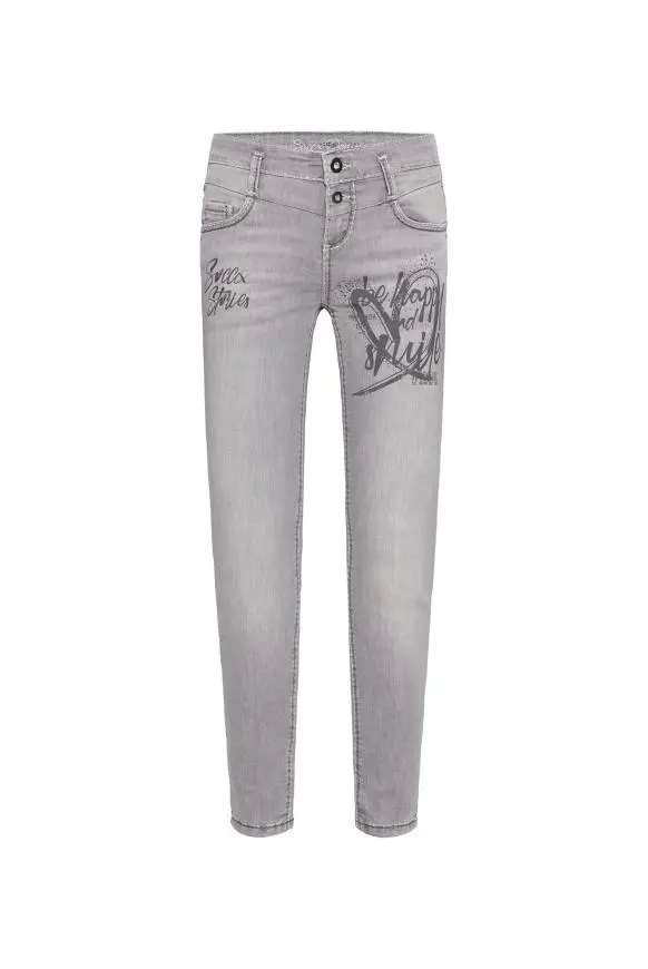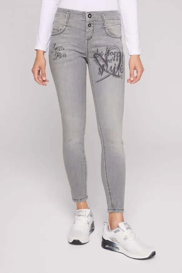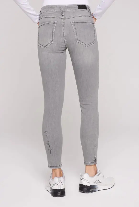 Džínů není nikdy dost! Tyto slim fit džíny od SOCCX zaujmou svým šedým použitým praním, hustými dvoubarevnými švy a knoflíkem na pasu. Ozdobné potisky štítků na přední straně a na levém lýtku dělají design dokonalý! Džíny mají dobrou elasticitu pro štíhlou a módně střiženou nohu. Materiál: 78,9 % bavlna, 18,6 % polyester, 2,5 % elastan