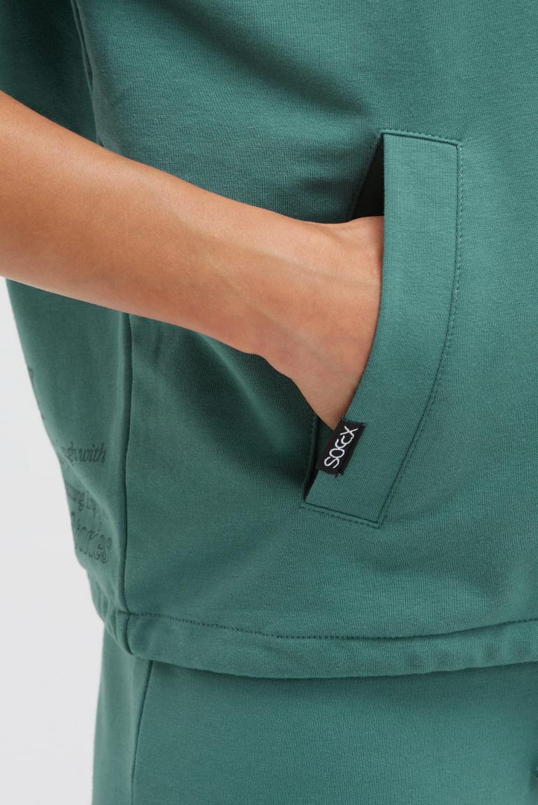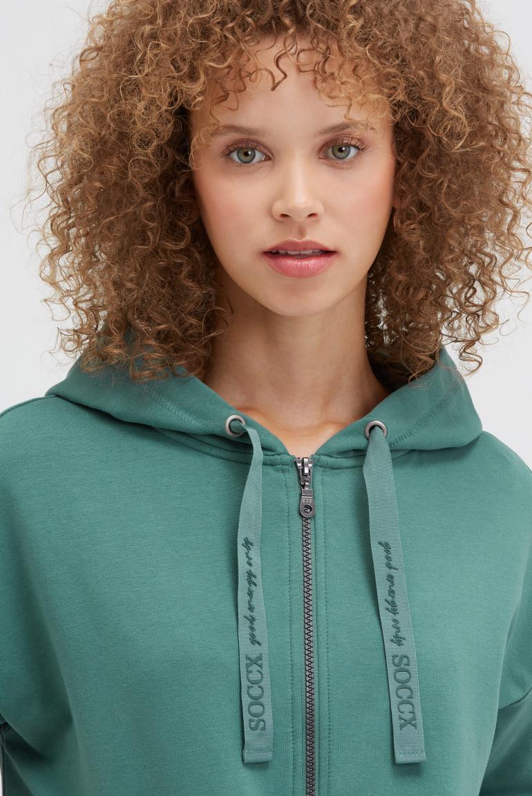 Tato krásná mikina s kapucí od SOCCX vytváří elegantní a ležérní vzhled. Místo manžet má stahovací šňůrku a tříčtvrteční rukávy, které bundě dodávají styl. Potisky v tónovaných tónech zvýrazňují zavazování kapuce a dekorativně se rozšiřují na záda. Materiál: 85% bavlna, 10% polyester, 5% elastan